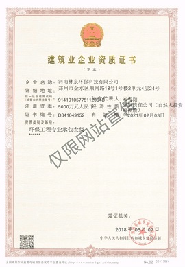 資質證書 河南林泉環保科技有限公司是一家國家高新技術企業。公司主要從事環保工程專業承包(設計、施工、設備安裝、工藝調試)一條龍服務,環境影響評價,清潔生產審計,環保技術服務,生態文明建設指導及規劃等工作。
